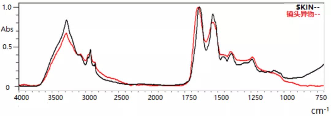 上圖中,黑色譜圖為焊錫不良處的紅外譜圖,紅色譜圖為IRON NAPHTHENATE(環烷酸鐵鹽)的標準紅外譜圖,兩圖在多處出峰位置一致,推斷樣品中含有環烷酸類物質。