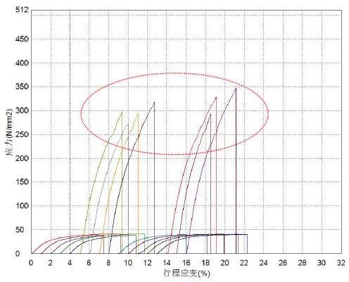 裁切方向不同的LCP膜斷裂方式和拉伸強度變化很大,圈中為W向曲線